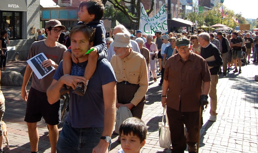 Here we are with this “unruly” group of protesters. Notice the age variation in just this picture, taken at random by my wife.We’ve decided that we want to at least be able tell the boys 20 years from now that we didn’t just lay down as the economy began to skew more and more toward the rich and as larger and larger swaths of the middle class began to fall into poverty. Similarly, as the corporations gain more and more power by making heavy contributions to BOTH parties (Republicans AND Democrats) we want to be able to say that we at least tried to join others who were raising their voices in dissent. We don’t want the EPA to get weaker and weaker every year as the oil industry and Big Coal writes and re-writes regulation so that it doesn’t get “in the way” of business. So we walked with about 700 Vermonters of all ages today in solidarity with the folks participating in the “Occupy Wall Street” protest in New York City. Truth is, when I first read about the protests a couple of weeks ago I snickered because I saw that they really didn’t have a clear sense of what they were asking for. They knew what they were protesting but not necessarily what they were proposing. Could this really be worth any one’s time? Or was it just clowning around for the cameras? But as the days wore on, as the protests continued and grew, and as I continued/continue to teach about the recent crisis of global capitalism, I started to “get it.” The point is not that the protesters will suddenly figure out and propose some magic solution to the massive economic inequality that has been growing for about 40 years now, by simply “occupying” Wall Street (as though anyone would allow it). The point is rather to raise a cry of dissent for the way in which our government has allowed the economy to shift priorities in recent years. Rather than finding ways to innovate and excel at making things our nation has become the global leader for marketing financial products, that is, selling investments and real estate, no matter how stupid they are. That emphasis on selling no matter what led to a temporary crisis that exposed a longer term crisis waiting to happen. The shift in economic priorities has made a few people very, very rich. And the huge bonuses doled out to executives of banks that were bailed out with tax dollars was just icing on the cake, and revealed how powerless the rest of the country really remains in such matters.* Meanwhile, as companies have grown larger (already as of 2000, 50 of the top 100 economies were corporations, while only 49 were countries) the Fortune 500 have become more and more focused on making short-term profits for their stock-holders, and that means any regulation is bad regulation, even if it means endangering the long-term viability of a business or a people.